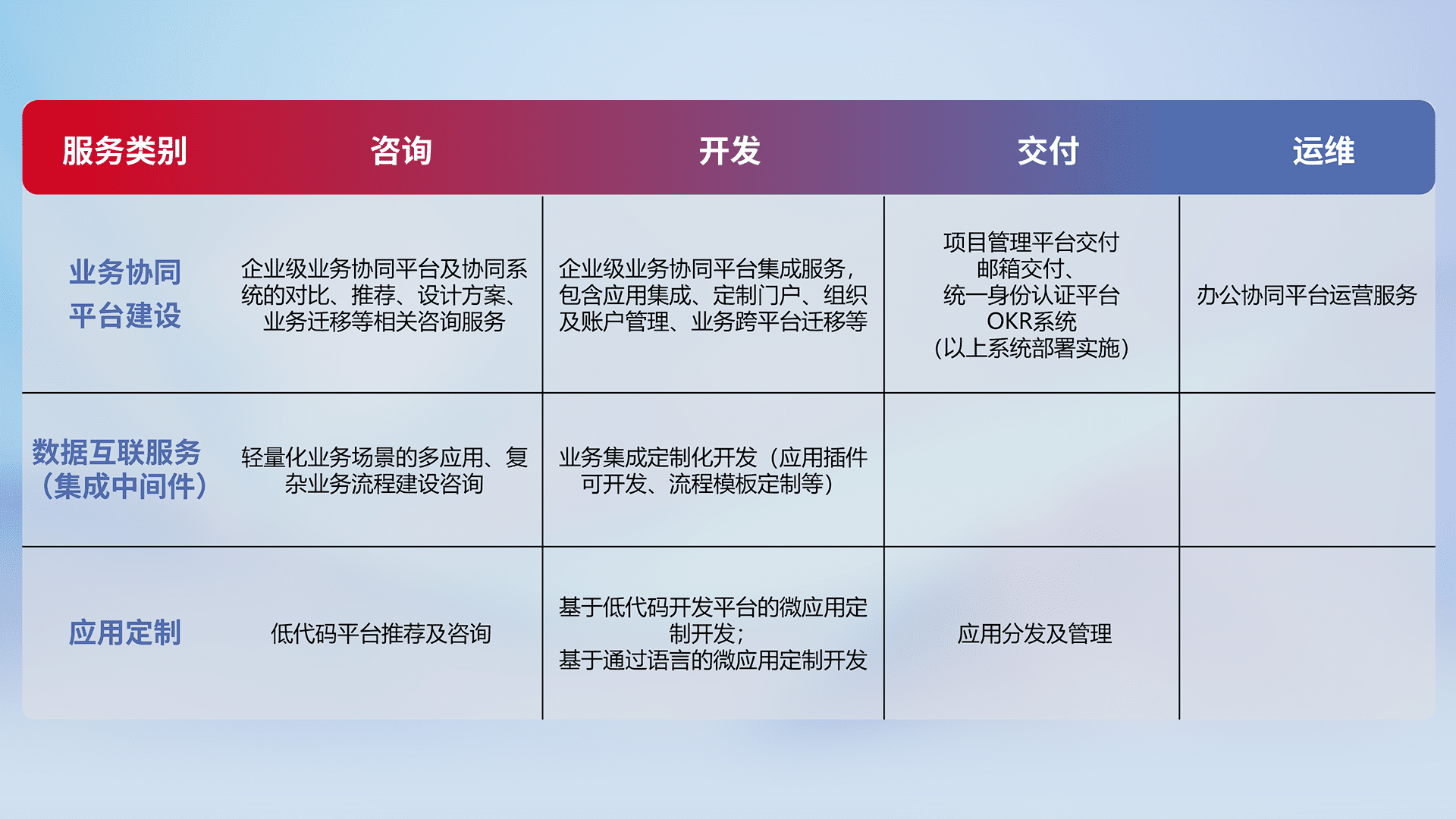 针对钉钉、、企微、、IDaas等平台级产品提供产品的规划、、、方案、、、、交付、、、、定制化开发等服务,,实现如统一协同办公、、、、智能客户服务、、、、混合会议管理、、、智能数据查询、、、等业务场景,,,,实现数字化转型。。。。
